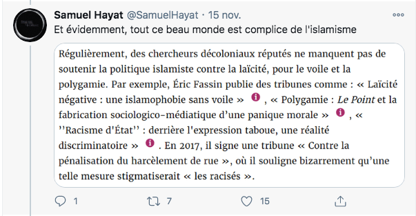 • … accusant les études post- / décoloniales de partialité et de racisme et dénonçant le soutien du CNRS avec des accents complotistes