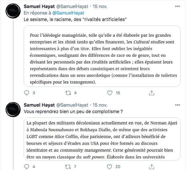Suite à l’article critique de François Rastier « Sexe, race et sciences sociales (2/4) – Révisions historiographiques » (29 octobre 2020, Revue Non Fiction), le chercheur Samuel Hayat a vertement réagi. Par tweet. C’est, semble-t-il, une mode générationnelle : on s’épargne du travail rédactionnel et l’ironie y tient lieu d’argumentation. Ce qui est indéniablement pratique quand on n’a pas d’arguments. C’est aussi une des nouvelles techniques de l’agit-prop et d’un mode de censure indirecte : on attaque en meute en ligne, on menace, on intimide. Il en restera bien quelque chose. Précisons qu’il s’agit d’un camp idéologique qui ne cesse de donner dans la lamentation victimaire et voit du fascisme partout — sauf dans les coups de force qu’ils lancent pour faire taire leurs adversaires.