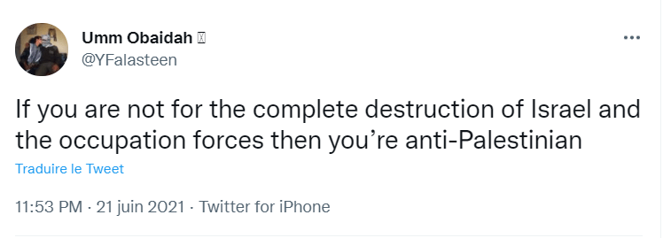“If you are not for the complete destruction of Israel and the occupation forces then you’re anti-Palestinian,”