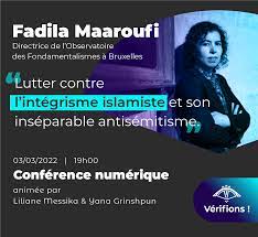 Fadila Maaroufi, la co-fondatrice de l’Observatoire des fondamentalismes à Bruxelles, Présidente, présidente du Comité de Soutien à la Commission d’Enquête Parlementaire Sarah Halimi et Gérante du Café Laïc à Bruxelles.