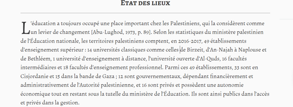 Si je comprends bien votre contre-argumentation, si les Israéliens ne pratiquent pas l’apartheid contre leurs citoyens non juifs, alors c’est contre leurs voisins palestiniens. Mais, voyez-vous, les Palestiniens en Cisjordanie comme à Gaza ont leur propre gouvernement et ils ne dépendent pas d’Israël, sauf quand pour des raisons obscures, ils viennent étudier dans les universités Israéliennes, alors qu’il existe 49 établissements supérieurs sur les territoires de l’Autonomie et à Gaza.