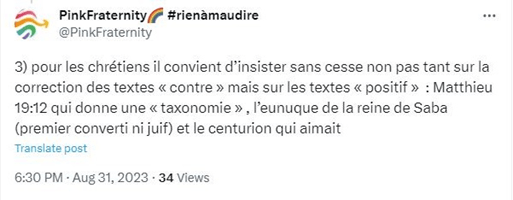 Et on a vu que c’est exactement le projet de #RienàGuérir : à peine le reportage sorti, Dunand s’en sert pour réclamer un « travail d’interprétation de la Bible »[xxxviii]. D’autres militants LGBT+ parlent franchement de « corriger les mauvais textes [bibliques] » et de promouvoir les « textes positifs [envers l’homosexualité]».
