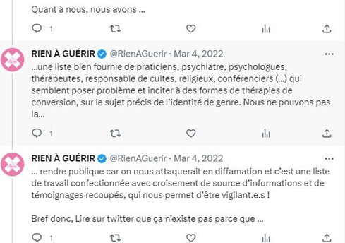 Cela qui n’empêche pas les trois comparses de #RienAGuérir, assistés de SOS Homophobie, de relancer aussitôt la campagne médiatique sur les « actes de tortures » sitôt le reportage sorti. Il faut persuader le téléspectateur moyen – qui n’a vu que quelques secondes d’images sur BFMTV – que les organisateurs sont des tortionnaires. L’association « Torrents de vie », jamais invitée, n’a aucune possibilité de se défendre.