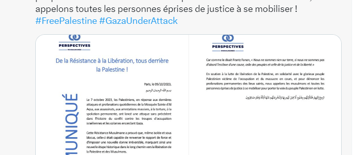 Ainsi, le « Nouveau parti anticapitaliste » (NPA), « refusant de se joindre à la litanie des appels à la prétendue désescalade ». a publié un communiqué soutenant le raid des terroristes du Hamas sur Israël, ainsi que les « moyens de lutte qu’ils et elles ont choisis pour résister ». De son côté le groupuscule intitulé « Les indigènes de la République » a posté sur Twitter l’hommage suivant : « Que la Résistance palestinienne qui mène son action avec détermination et confiance dans des conditions héroïques reçoive en ces heures terribles toute notre fraternité militante. La Palestine vaincra, et sa Victoire sera la nôtre (…) Gloire à la résistance palestinienne ».