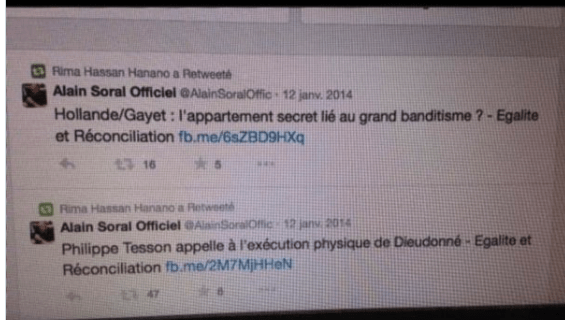 Dans le passé Mme Hassan retweetait les messages postés par Soral, pour défendre Dieudonné dont l’idéologie antisémite a fait l’objet de plusieurs condamnations. Tout son parcours médiatico-politique est lié à la haine des Juifs et aux mensonges inventés pour assoir sa haine. Si les Palestiniens l’intéressaient, on l’aurait entendue à propos du massacre de Yarmouk où Assad a exterminé environ 100 000 Palestiniens, y compris les femmes et les enfants. L’insurrection à laquelle elle appelle incite à la haine d’Israël.